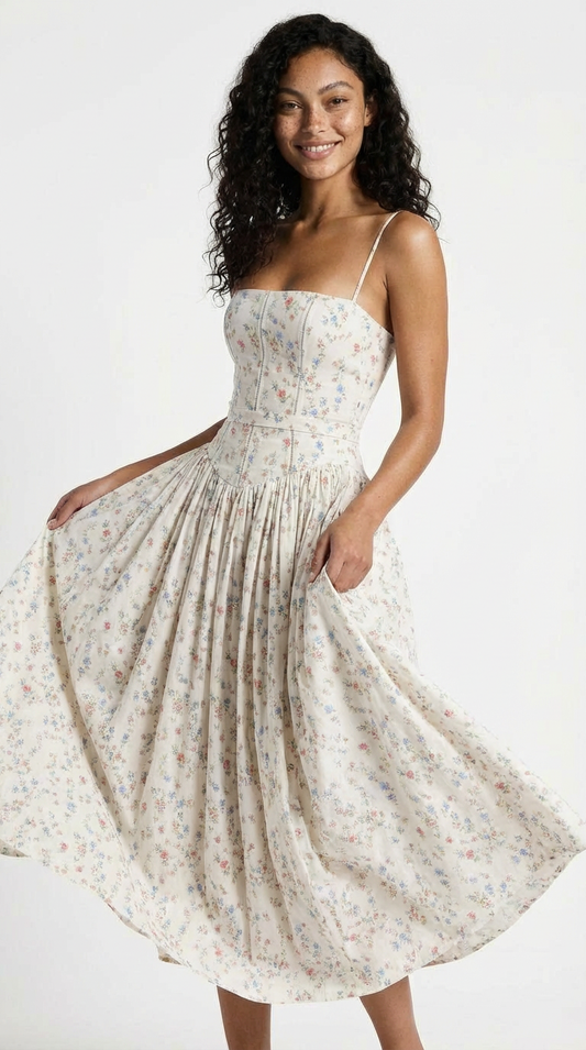 Ivory Ditsy Floral Corset Midi Dress